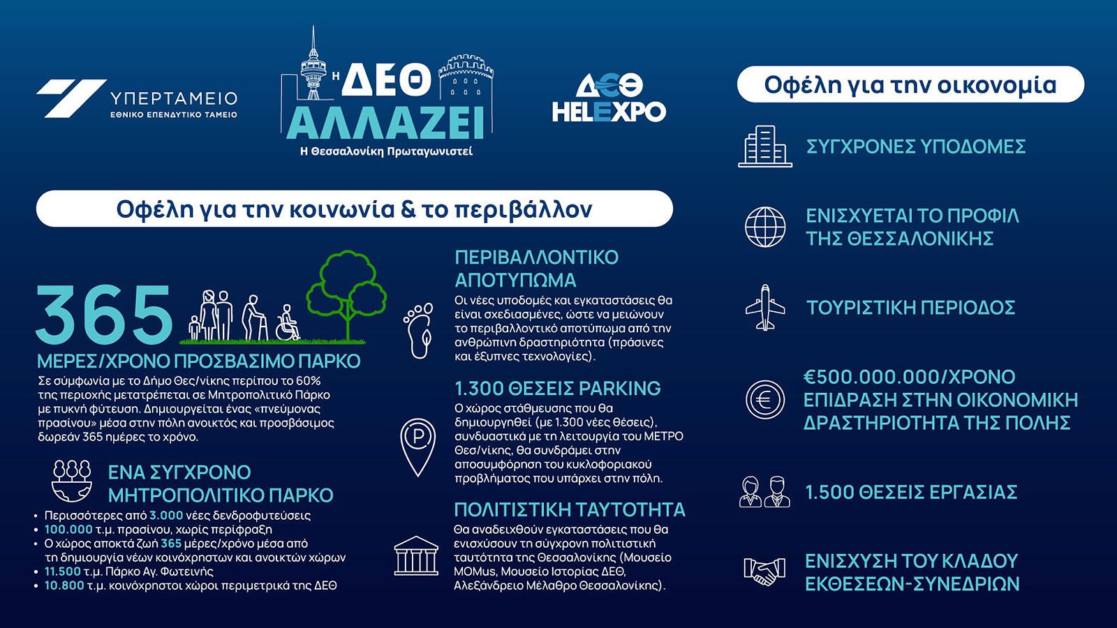 Εκφράζοντας την ικανοποίησή του για την πρόοδο του Έργου, ο κ. Αναστάσιος Τζήκας, πρόεδρος της ΔΕΘ – HELEXPO σημείωσε: “Η Ανάπλαση της ΔΕΘ είναι ένα εμβληματικό έργο, το οποίο με την ολοκλήρωσή του θα μετατρέψει τη Θεσσαλονίκη σε μια άλλη πόλη. Μια πόλη πιο πράσινη, περισσότερο ανταγωνιστική στο διεθνές περιβάλλον και πιο ελκυστική για τους κατοίκους της και ειδικότερα για τους νέους. Η σημερινή υπογραφή της Σύμβασης με το Growthfund και το ΤΑΙΠΕΔ κλείνει έναν μεγάλο κύκλο μελετών, διεθνών διαγωνισμών, εγκρίσεων και διαβουλεύσεων με την κοινωνία και τους φορείς και ανοίγει έναν νέο κύκλο για την ωρίμανση του έργου και την προετοιμασία των τευχών δημοπράτησής του. Τελικός στόχος όλων μας είναι να αποκτήσει η Θεσσαλονίκη το πιο βιοκλιματικό και λειτουργικό Εκθεσιακό και Συνεδριακό Κέντρο της Ευρώπης”.