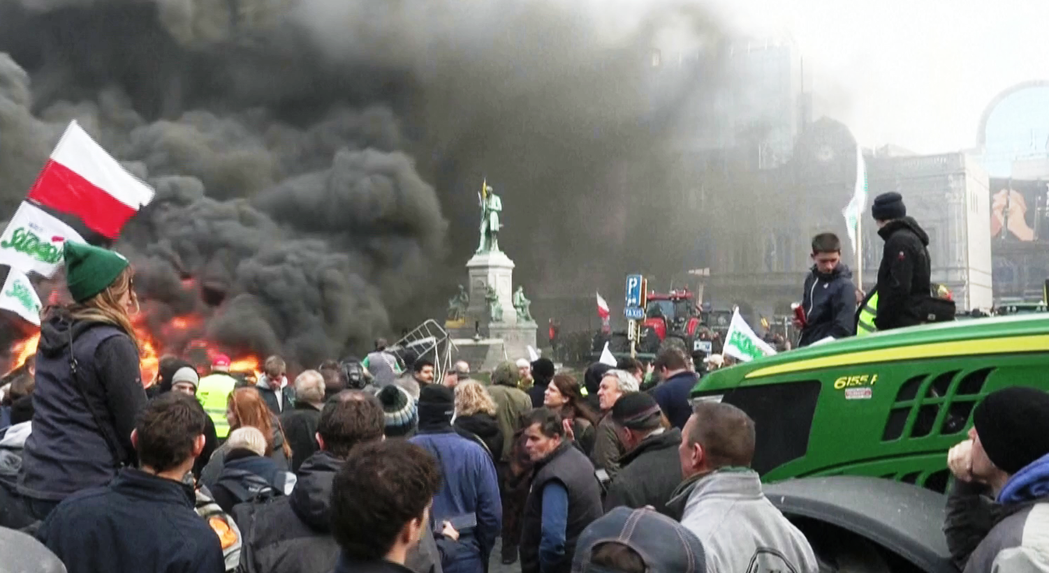 Σύμφωνα με την ανταποκρίτρια του ΕΡΤnews, Έλενα Αποστολίδου, το σκηνικό μπροστά από το Ευρωπαϊκό Κοινοβούλιο θύμιζε βομβαρδισμένη περιοχή. Τα τρακτέρ των αγροτών έχουν απομακρυνθεί, ενώ οι πυροσβεστικές δυνάμεις σβήνουν τις τελευταίες φωτιές. Ο χριστουγεννιάτικος στολισμός έχει καεί, ενώ στο άγαλμα τοποθετήθηκε φέρετρο, συμβολίζοντας, σύμφωνα με τους διαδηλωτές, το τέλος της αγροτικής γης και του επαγγέλματος. Παρά τις προσπάθειες της αστυνομίας να απελευθερώσει τους δρόμους, οι αγρότες δηλώνουν ότι σκοπεύουν να παραμείνουν στο κέντρο και τις βραδινές ώρες.