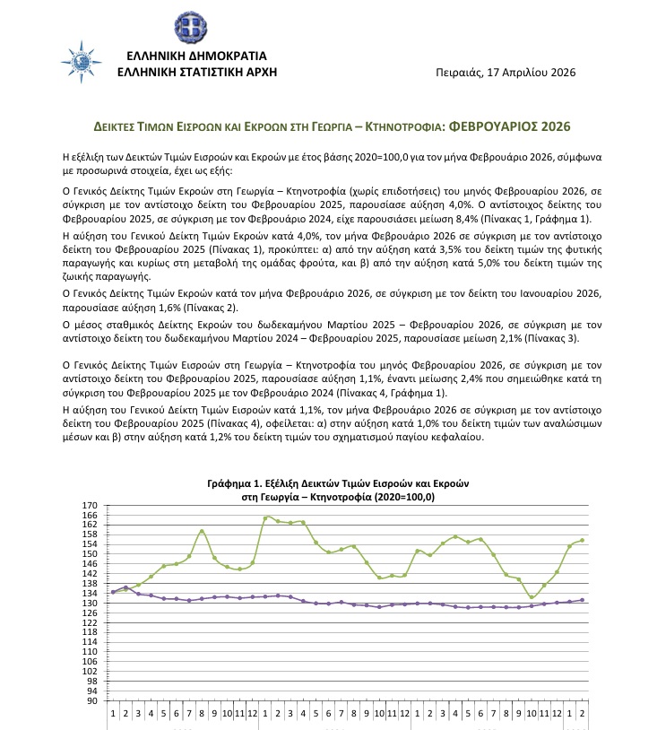 Αναλυτικά την έκθεση της ΕΛΣΤΑΤ ΔΕΙΚΤΕΣ ΤΙΜΩΝ ΕΙΣΡΟΩΝ ΚΑΙ ΕΚΡΟΩΝ ΣΤΗ ΓΕΩΡΓΙΑ – ΚΤΗΝΟΤΡΟΦΙΑ: ΦΕΒΡΟΥΑΡΙΟΣ 2026
