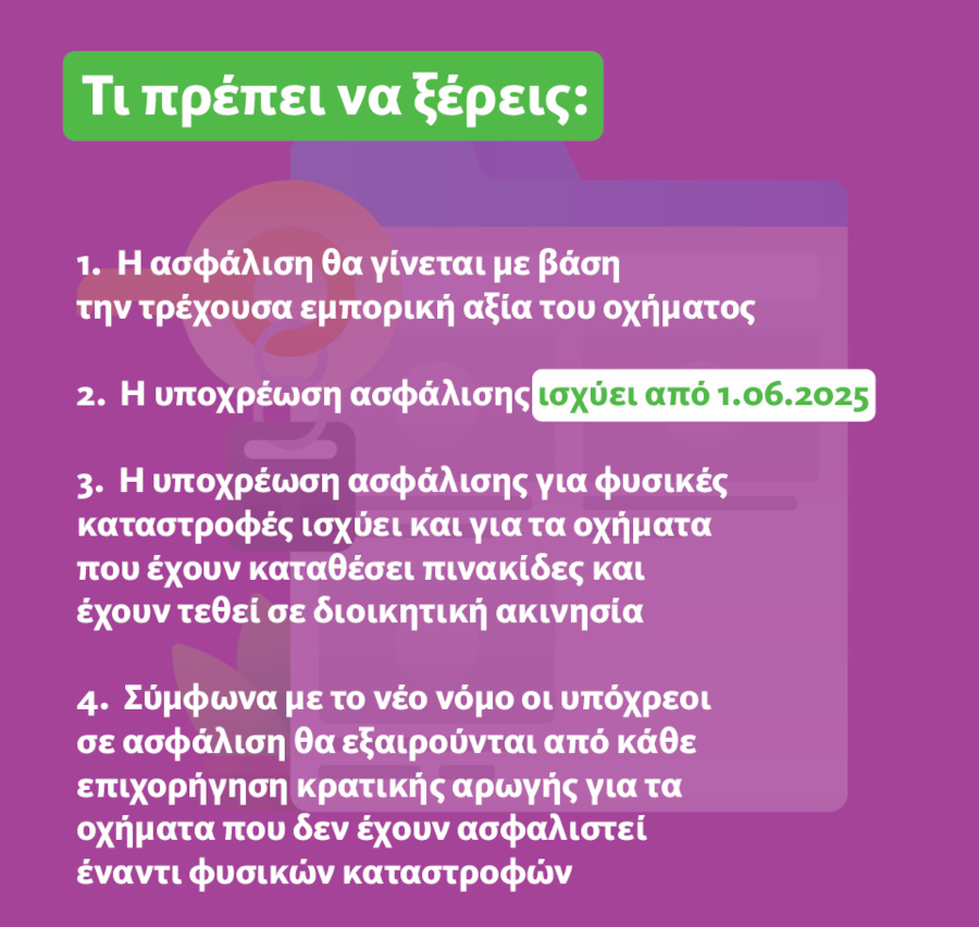 Πρέπει να σημειωθεί ότι όσοι οδηγοί δεν προχωρήσουν σε ασφάλιση δεν θα αντιμετωπίσουν χρηματικά πρόστιμα. Ωστόσο, σε περίπτωση ζημιάς από φυσική καταστροφή, δεν θα δικαιούνται καμία μορφή κρατικής ενίσχυσης ή αποζημίωσης.