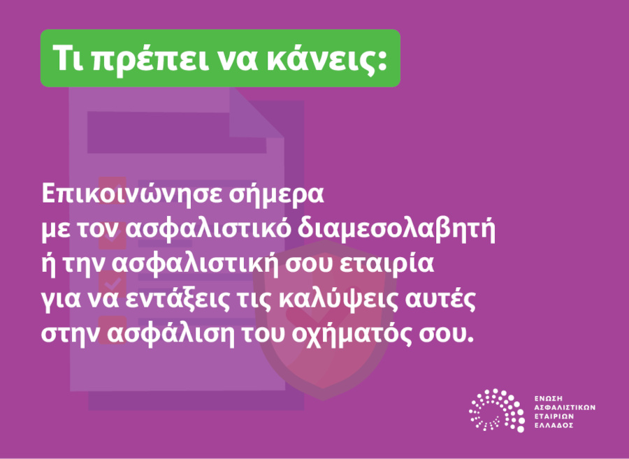 Η ΕΑΕΕ συστήνει στους ιδιοκτήτες οχημάτων να επικοινωνήσουν με την ασφαλιστική τους εταιρία ή τον διαμεσολαβητή τους για να εντάξουν τις καλύψεις αυτές στην ασφάλιση του οχήματός τους. Σημειώνεται ότι για την ασφάλιση των επαγγελματικής χρήσης οχημάτων επιχειρήσεων με τζίρο πάνω από 500.000 ευρώ υφίσταται ο ν.5116/2024.