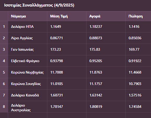Η Τράπεζα της Ελλάδος ανακοίνωσε τις ισοτιμίες συναλλάγματος για τις 4 Σεπτεμβρίου 2025. Οι όροι συναλλαγών με τράπεζες και ανταλλακτήρια