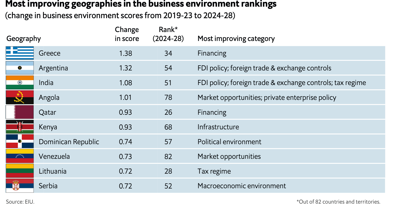 «Η Ελλάδα πέτυχε τη μεγαλύτερη βελτίωση στη βαθμολογία του δείκτη επιχειρηματικού περιβάλλοντος, που καταρτίζει ο Economist, σύμφωνα με τη σχετική έρευνα που δημοσιοποιήθηκε σήμερα.