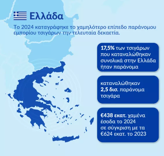 - Το ποσοστό των παράνομων τσιγάρων εκτιμάται στο 17,5% της συνολικής κατανάλωσης τσιγάρων, μειωμένο κατά 6,2 ποσοστιαίες μονάδες σε σύγκριση με το 2023 (23,7%).