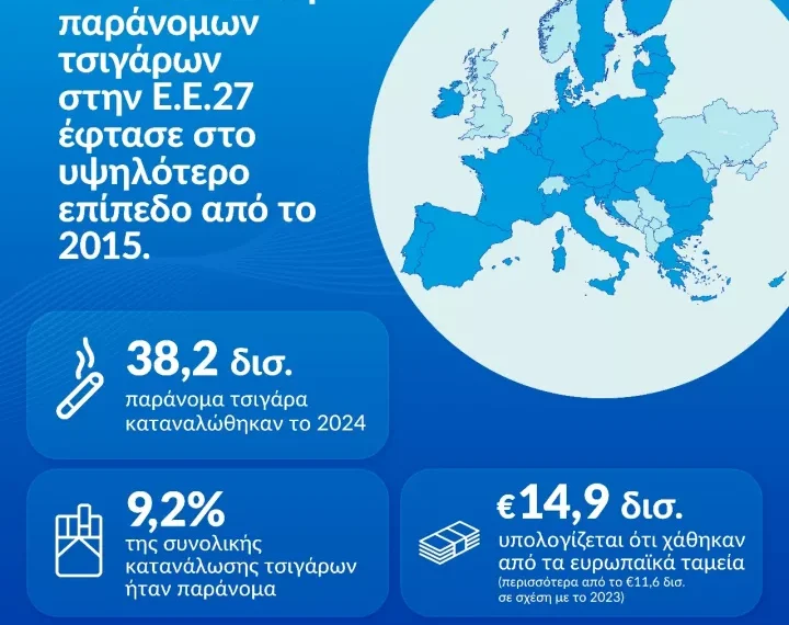 - Σε επίπεδο Ευρωπαϊκής Ένωσης καταναλώθηκαν 38,9 δισεκατ. παράνομα τσιγάρα και οι απώλειες των εσόδων για τα δημόσια ταμεία υπολογίζονται σε 14,9 δισεκατ. ευρώ (+3,3 δισεκατ. ευρώ σε σχέση με το 2023).