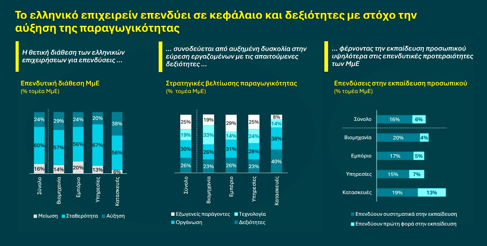 Η ενίσχυση των επενδύσεων σε φυσικό κεφάλαιο συνοδεύεται πλέον από αυξημένη έμφαση στην ανάπτυξη ανθρώπινου κεφαλαίου. Η έρευνα δείχνει ότι οι ελληνικές μικρομεσαίες επιχειρήσεις επιδιώκουν να ενισχύσουν την παραγωγικότητα μέσω της αναβάθμισης δεξιοτήτων του προσωπικού, σε συνδυασμό με την υιοθέτηση νέων τεχνολογιών και τη βελτίωση των εσωτερικών διαδικασιών.