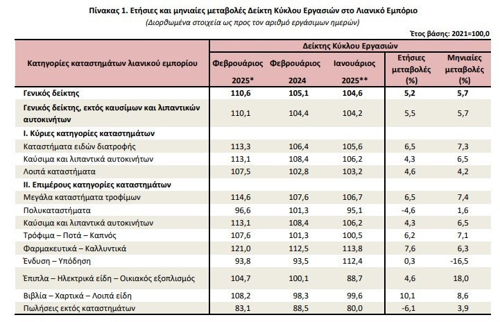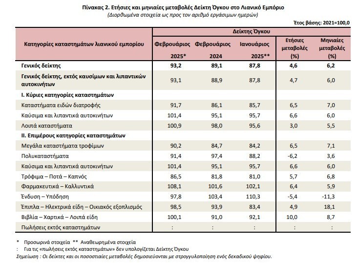 Άνοδος 5,2% στον κύκλο εργασιών του λιανεμπορίου τον Φεβρουάριο του 2025, σύμφωνα με την ΕΛΣΤΑΤ. Αύξηση και στον όγκο πωλήσεων