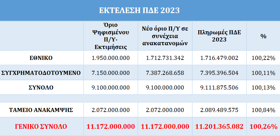 Το 2023 η εθνική οικονομία κατέγραψε υψηλές επιδόσεις και παρουσίασε δυναμική ανάπτυξη στην οποία οι δημόσιες επενδύσεις συνέβαλαν καθοριστικά. Το 2023 εκτελέστηκε το Πρόγραμμα Δημοσίων Επενδύσεων (ΠΔΕ) στο σύνολό του (ποσοστό 100%), ενισχύοντας την πραγματική οικονομία με συνολικούς πόρους ύψους 11,2 δισ. ευρώ, αυξημένους κατά 176 εκατ. ευρώ σε σύγκριση με το 2022. Ειδικότερα: