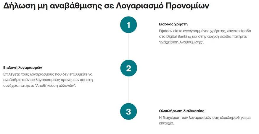 «Για την αναβάθμιση στον Λογαριασμό Προνομίων δεν απαιτείται κάποια ενέργεια από εσάς καθώς στις 23/05/2025 οι λογαριασμοί απλό Ταμιευτήριο / απλός Τρεχούμενος στους οποίους είστε δικαιούχος θα μετατραπούν αυτόματα στον νέο Λογαριασμό Προνομίων, διατηρώντας τον ίδιο αριθμό λογαριασμού».