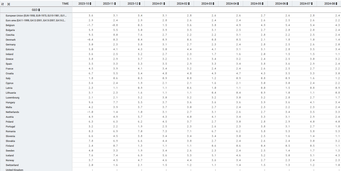 Ενώ όσον αφορά στον πληθωρισμό της Ευρωζώνης επισημαίνεται πως αυτός υποχώρησε στο 2,2% τον Αύγουστο του 2024 σε ετήσια βάση από 2,6 % που ήταν τον Ιούλιο και 5,2% που ήταν 1 χρόνο νωρίτερα. Επίσης επισημαίνεται πως ο πληθωρισμός της Ευρωπαϊκής Ένωσης διαμορφώθηκε στο 2,4% τον Αύγουστο σε ετήσια βάση από 2,8% που ήταν τον Ιούλιο και 5,9% που ήταν 1 χρόνο νωρίτερα.