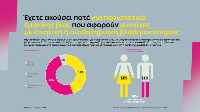 - Περισσότερα από 2 στα 5 άτομα δηλώνουν ότι έχουν ακούσει για περιστατικό έμφυλης βίας σε γυναίκα με αναπηρία