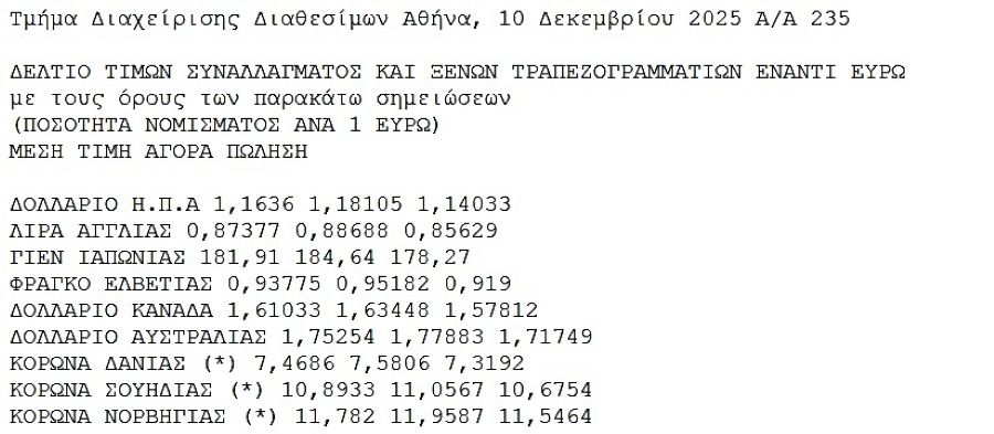 Η Τράπεζα της Ελλάδος δημοσίευσε το δελτίο τιμών συναλλάγματος και ξένων τραπεζογραμματίων έναντι του ευρώ, με ημερομηνία 10 Δεκεμβρίου 2025. Το ευρώ εμφανίζει σταθεροποιητική εικόνα σε σχέση με τα βασικά διεθνή νομίσματα, χωρίς έντονες διακυμάνσεις.