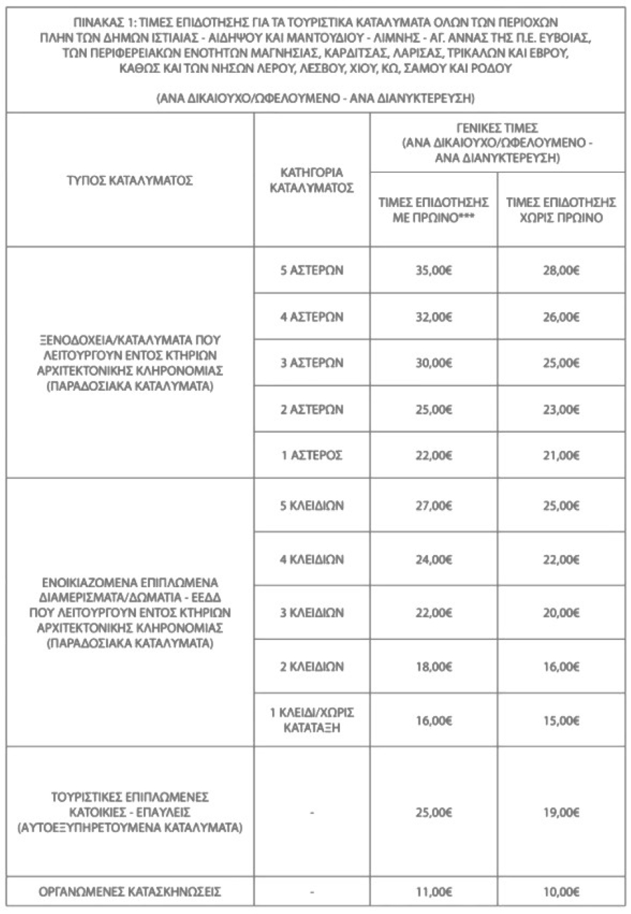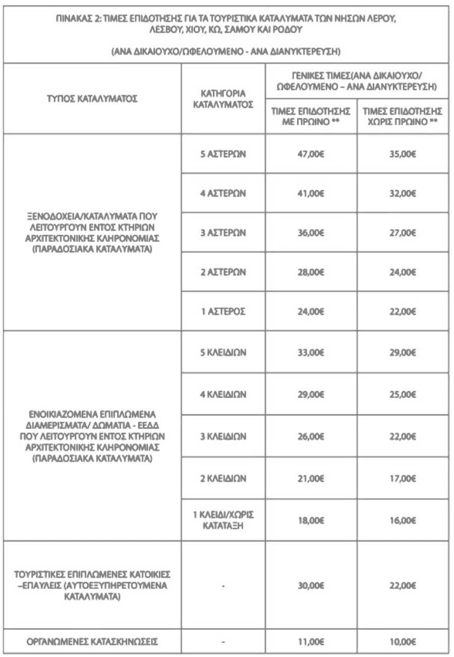 Τα ποσά επιδότησης για τη διαμονή θα διαφοροποιούνται ανάλογα με τον τύπο και την κατηγορία του καταλύματος, την τοποθεσία και την τουριστική περίοδο.