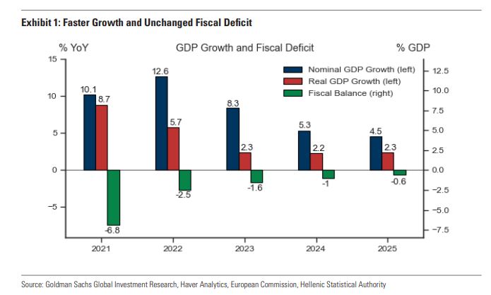 Ο επενδυτικός κολοσσός επικαλείται τα στοιχεία της ΕΛΣΤΑΤ που δείχνουν ανάπτυξη 2,3%, έναντι 2% της προηγούμενης εκτίμησης και ονομαστική αύξηση του ΑΕΠ κατά 8,3%, έναντι 6,6%.