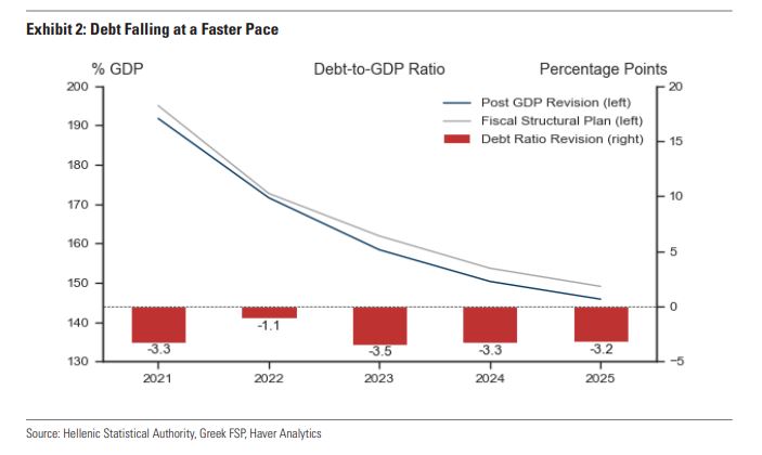 Με αυτά τα στοιχεία και λαμβάνοντας υπόψιν τις προβλέψεις του Μεσοπρόθεσμου Πλαισίου Δημοσιονομικής Στρατηγικής, η Goldman Sachs παρατηρείότι ο λόγος του ελληνικού χρέους ως προς το ΑΕΠ θα μειωθεί περαιτέρω, φθάνοντας στο 145,8% του ΑΕΠ το 2025, δηλαδή 3,2 ποσοστιαίες μονάδες χαμηλότερα από την προηγούμενη εκτίμηση του οίκου και σημαντικά μειωμένο από το 207% του ΑΕΠ που είχε φτάσει το 2020.