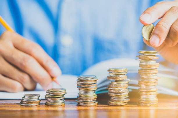 hand add coin to coin stack, saving money concept and finance accounting concept.