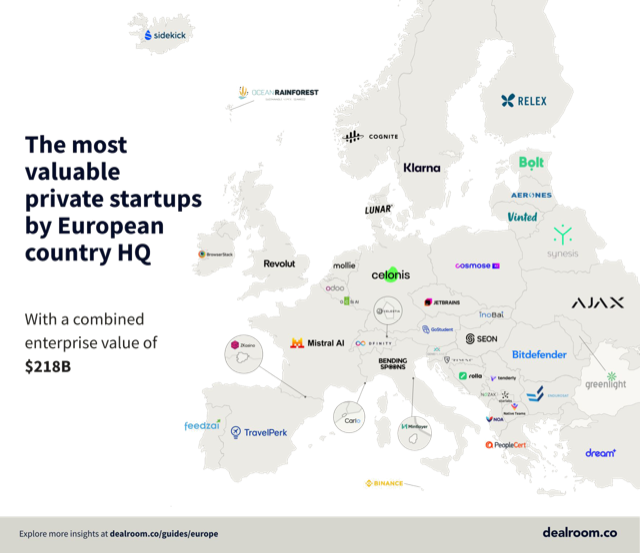 Στον χάρτη που δημοσίευσε η ολλανδική εταιρεία, παρουσιάζονται οι πλέον δυναμικές startup εταιρείες ανά χώρα στην Ευρώπη και την Ευρασία. Ενδεικτικά, μεταξύ των χωρών της Ευρωπαϊκής ηπείρου, στην κορυφή βρίσκεται η βρετανική Revolut (Fintech), ενώ στην Ισπανία αναδεικνύεται η TravelPerk (Business Travel), στη Γαλλία η Mistral AI (Artificial Intelligence), στη Γερμανία η Celonis (Process Mining), στην Ιταλία η Bending Spoons (App Development), στην Ολλανδία η Mollie (Payments) και στη Σουηδία η Klarna (Buy Now, Pay Later).