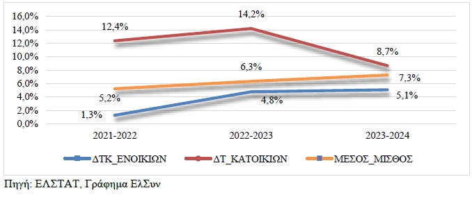 Επίσης, τα ενοίκια, αν και αυξήθηκαν με πιο ήπιο ρυθμό το 2022 (1,3%), παρουσίασαν έντονη επιτάχυνση τα επόμενα έτη, με μεταβολή 4,8% το 2023 και 5,1% το 2024, επιβαρύνοντας σημαντικά τους ενοικιαστές.