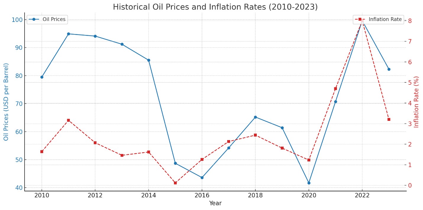 Η ιστορική πορεία των τιμών πετρελαίου και η σχέση τους με τον πληθωρισμό παρουσιάζουν μια ενδιαφέρουσα και δυναμική συσχέτιση. Το παρακάτω διάγραμμα δείχνει την ιστορική πορεία των τιμών του πετρελαίου (USD ανά βαρέλι) και τα επίπεδα πληθωρισμού (%) από το 2010 έως το 2023.