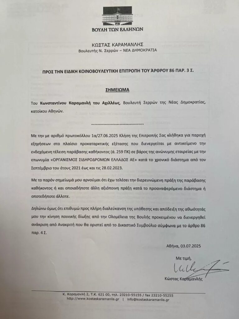 Προανακριτική για Τέμπη: Μέσω γραπτού υπομνήματος αναμένεται να τοποθετηθεί σήμερα στη συνεδρίαση της Προανακριτικής για τα Τέμπη ο πρώην υπουργός Υποδομών και Μεταφορών Κώστας Καραμανλής.