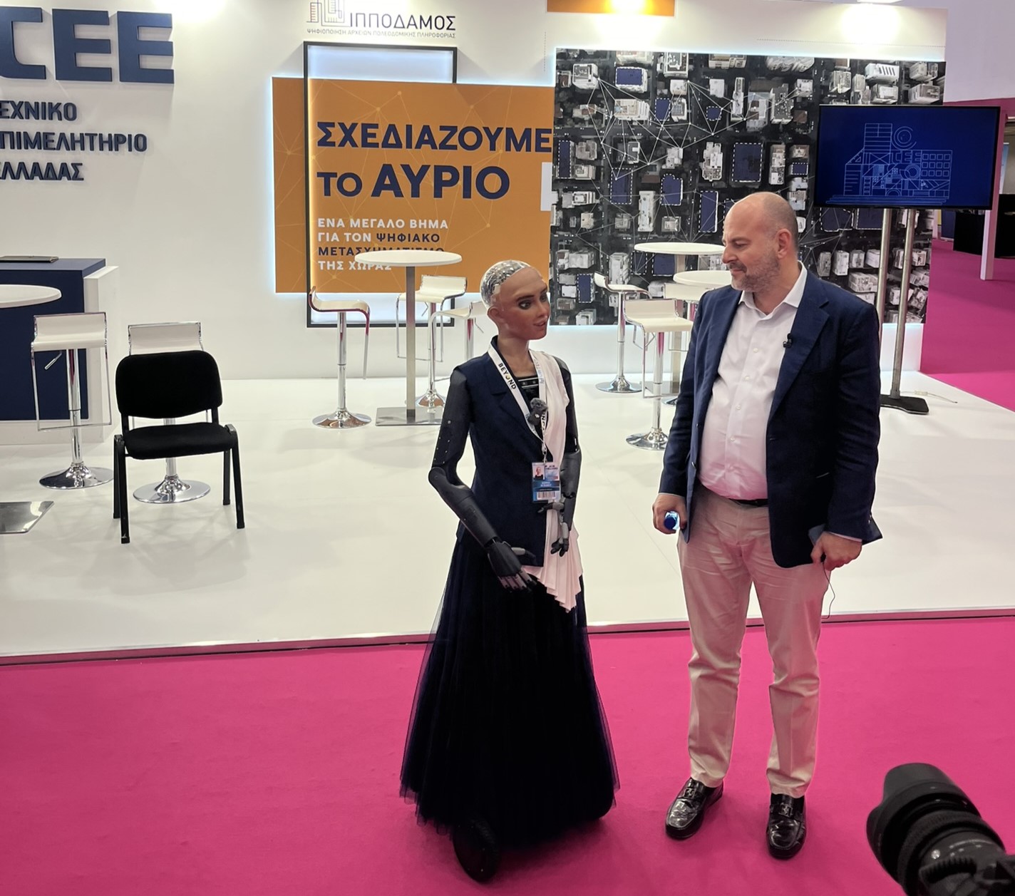 Μια ξεχωριστή στιγμή χαρακτήρισε την παρουσία του Προέδρου του ΤΕΕ Γιώργου Στασινού στο περίπτερο του ΤΕΕ στην έκθεση «BEYOND 2024» στη Θεσσαλονίκη, όταν συναντήθηκε με τη Sophia the robot, το ανθρωποειδές ρομπότ με χρήση τεχνητής νοημοσύνης.