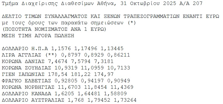 Σύμφωνα με το Δελτίο Τιμών Συναλλάγματος και Ξένων Τραπεζογραμματίων που εξέδωσε το Τμήμα Διαχείρισης Διαθεσίμων της Τράπεζας της Ελλάδος στις 31 Οκτωβρίου 2025, η μέση ισοτιμία του ευρώ έναντι του δολαρίου διαμορφώθηκε στα 1,1576, καταγράφοντας μικρή πτώση σε σχέση με την προηγούμενη εβδομάδα. Η τιμή αγοράς ορίστηκε στα 1,17496 και η τιμή πώλησης στα 1,13445 δολάρια.