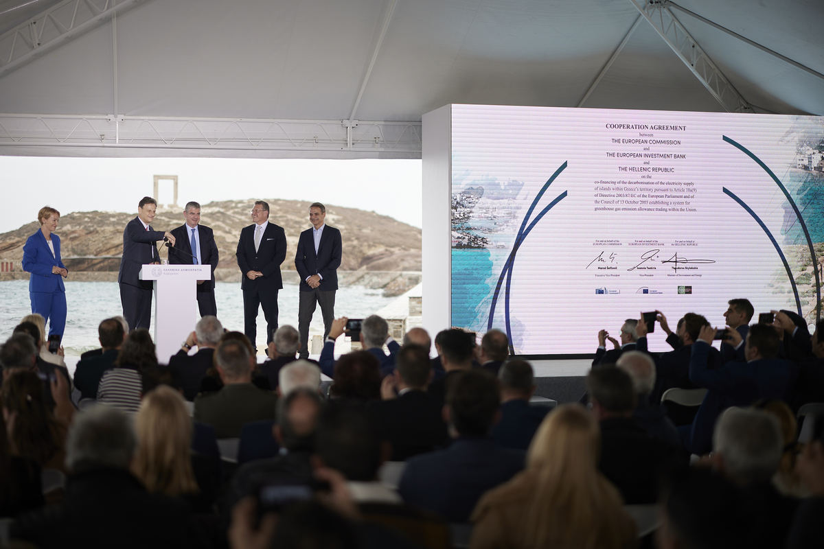(Ξένη Δημοσίευση) Ο πρωθυπουργός Κυριάκος Μητσοτάκης, ο αντιπρόεδρος και εκτελεστικός αντιπρόεδρος για την Ευρωπαϊκή Πράσινη Συμφωνία, Μάρος Σέφτσοβιτς, ο υπουργός Περιβάλλοντος και Ενέργειας Θόδωρος Σκυλακάκης και ο αντιπρόεδρος της Ευρωπαϊκής Τράπεζας Επενδύσεων (ΕΤΕπ) Ιωάννης Τσακίρης, συμμετέχουν στην υπογραφή της σύμβασης για τη σύσταση του Ταμείου Απανθρακοποίησης Νησιών, στο λιμάνι της Νάξου, Πέμπτη 21 Νοεμβρίου 2024. Ο Πρωθυπουργός Κυριάκος Μητσοτάκης παρέστη στην τελετή υπογραφής της σύμβασης μεταξύ της Ευρωπαϊκής Επιτροπής, της Ευρωπαϊκής Τράπεζας Επενδύσεων και της Ελληνικής Δημοκρατίας για τη σύσταση του Ταμείου Απανθρακοποίησης Νησιών, που πραγματοποιήθηκε στο λιμάνι της Νάξου. ΑΠΕ-ΜΠΕ/ΓΡΑΦΕΙΟ ΤΥΠΟΥ ΠΡΩΘΥΠΟΘΥΡΓΟΥ/ΔΗΜΗΤΡΗΣ ΠΑΠΑΜΗΤΣΟΣ