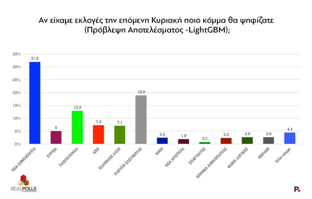 Στην πρόβλεψη αποτελέσματος, όπου κατανέμεται η αδιευκρίνιστη ψήφος, η Νέα Δημοκρατία εκτιμάται στο 31,9%, ξεπερνώντας άνετα το ποσοστό των ευρωεκλογών του 2023 (28,31%) και δείχνοντας ξεκάθαρη ανοδική τάση. Σε αυτή τη μέτρηση, η Πλεύση Ελευθερίας ανεβαίνει στο 18,9%, το ΠΑΣΟΚ-ΚΙΝΑΛ στο 12,9%, το ΚΚΕ στο 7,3% και η Ελληνική Λύση στο 7,1%. Ο ΣΥΡΙΖΑ συμπιέζεται περαιτέρω στο 5%. Η εικόνα της εξακομματικής Βουλής που προκύπτει από την πρόβλεψη αποτελέσματος θα μπορούσε δυνητικά να επηρεάσει τους όρους διεκδίκησης αυτοδυναμίας από τη ΝΔ, παρόλο που η αντιπολίτευση αδυνατεί να αναδείξει έναν ενιαίο πόλο.