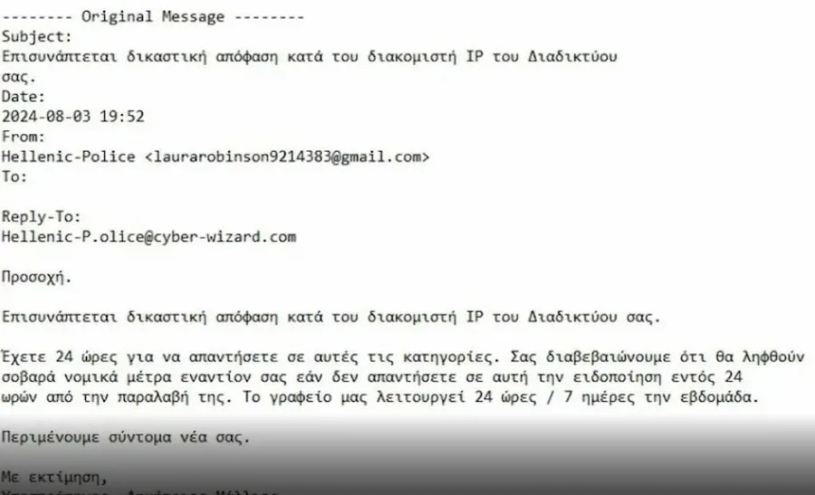 Στην προκειμένη περίπτωση, η επιστολή αποστέλλεται μέσω μηνύματος ηλεκτρονικού ταχυδρομείου (email) ως συνημμένο έγγραφο, ενώ στο σώμα του email ο αποδέκτης προτρέπεται να απαντήσει εντός 24 ωρών από την παραλαβή της ειδοποίησης. Μάλιστα, ως υπογράφων του μηνύματος εμφαίνεται ο Αρχηγός της Ελληνικής Αστυνομίας.