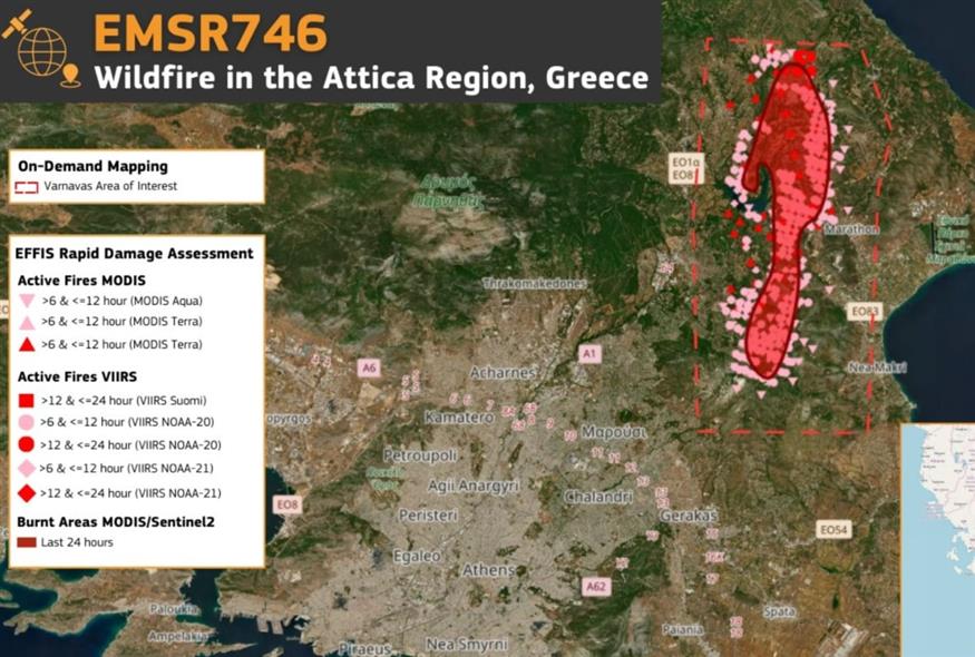 Το πρόγραμμα γεωσκόπησης της Ευρωπαϊκής Ένωσης, Copernicus δημοσίευσε μια εικόνα στην πλατφόρμα Χ που αποτυπώνει δορυφορικά το μέγεθος της πυρκαγιάς στην Αττική που ξεκίνησε το μεσημέρι της Κυριακής στον Βαρνάβα και στη συνέχεια επεκτάθηκε ραγδαία.