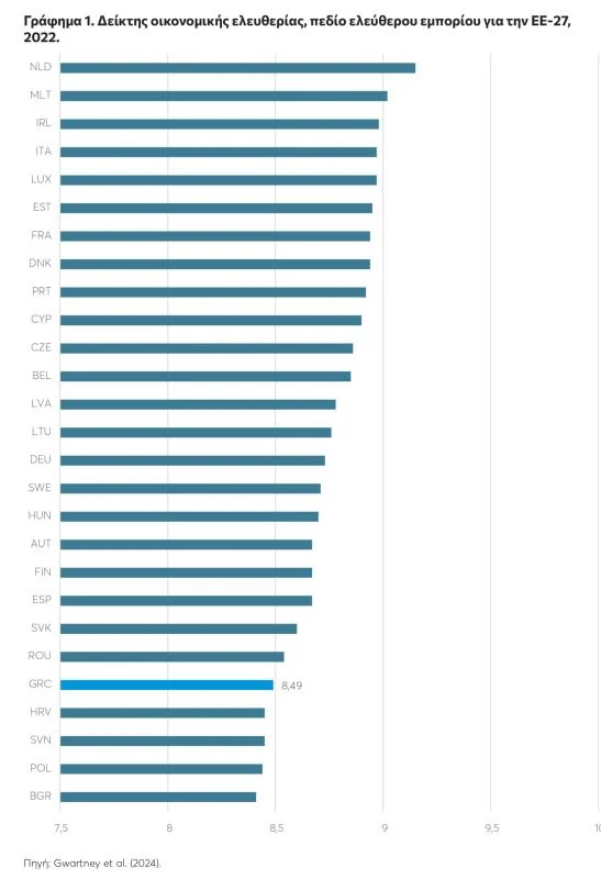ΚΕΦΙΜ: Ελλάδα καταλαμβάνει την 23η θέση μεταξύ των 27 χωρών της ΕΕ με βαθμολογία 8,49 στα 10 στον Δείκτη Οικονομικής Ελευθερίας για το 2022, όσον αφορά τις γενικές επιδόσεις στο πεδίο του ελεύθερου εμπορίου. Η πορεία αυτή σηματοδοτεί μια σημαντική ανάκαμψη, ειδικά μετά την πλήρη άρση των κεφαλαιακών ελέγχων το 2020, που είχαν επιβληθεί το 2015 και είχαν οδηγήσει τη χώρα σε ιστορικό χαμηλό βαθμολογίας (0,77 στα 10).