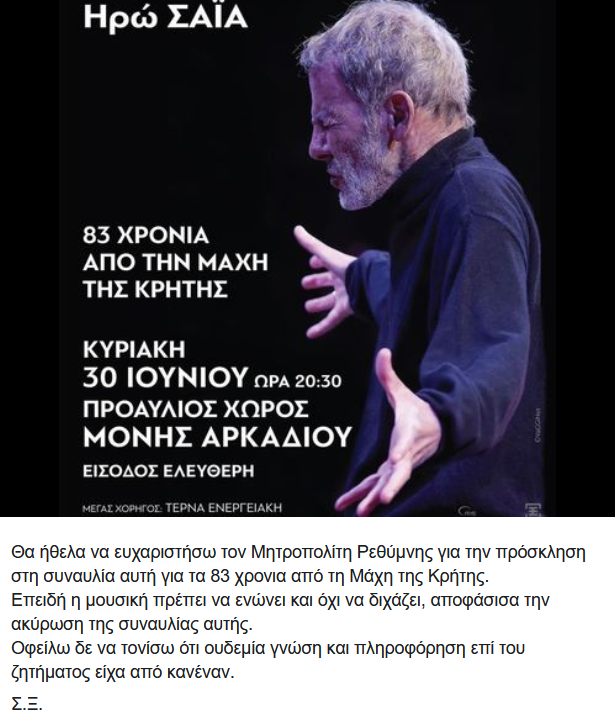 Ο μουσικοσυνθέτης σημειώνει σε ανάρτησή του στα μέσα κοινωνικής δικτύωσης πως «θα ήθελα να ευχαριστήσω τον Μητροπολίτη Ρεθύμνης για την πρόσκληση στη συναυλία αυτή για τα 83 χρόνια από τη Μάχη της Κρήτης», αναφερόμενος στην ακύρωση της συναυλίας.