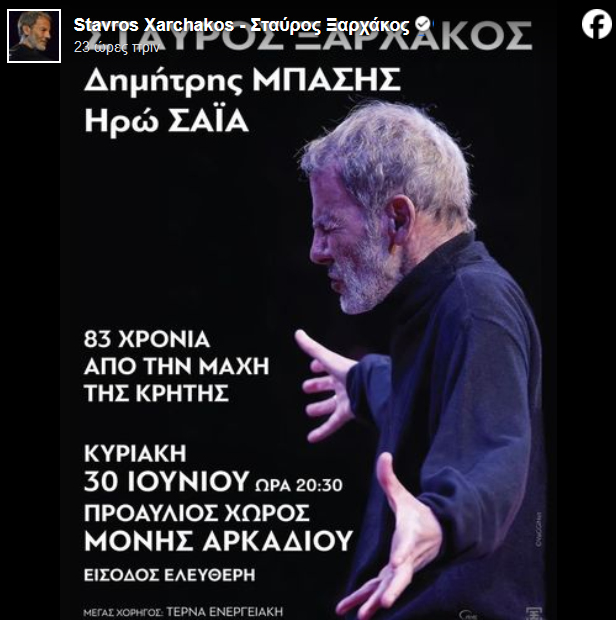 Ο Σεβ. Μητροπολίτης Ρεθύμνης και Αυλοποτάμου κ. Πρόδρομος, ανταποκρινόμενος θετικά σε επιστολή της 16ης Μαΐου 2024, από τον έχοντα την πρωτοβουλία της διοργάνωσης, συντοπίτη μας κ. Γεώργιο Πανταγιά, αποδέχθηκε τη φιλοξενία της εν λόγω εκδήλωσης στον εξωτερικό προαύλιο χώρο της Ιεράς Μονής Αρκαδίου, για δύο λόγους: την επέτειο της Μάχης της Κρήτης και την παρουσία του κορυφαίου Έλληνα συνθέτη και δημιουργού κ. Σταύρου Ξαρχάκου. Ο Σεβασμιώτατος ουδέποτε προσκάλεσε, γραπτώς ή προφορικώς, τον κ. Ξαρχάκο, τους καλλιτέχνες, τους συντελεστές, τους χορηγούς ή άλλους φορείς.