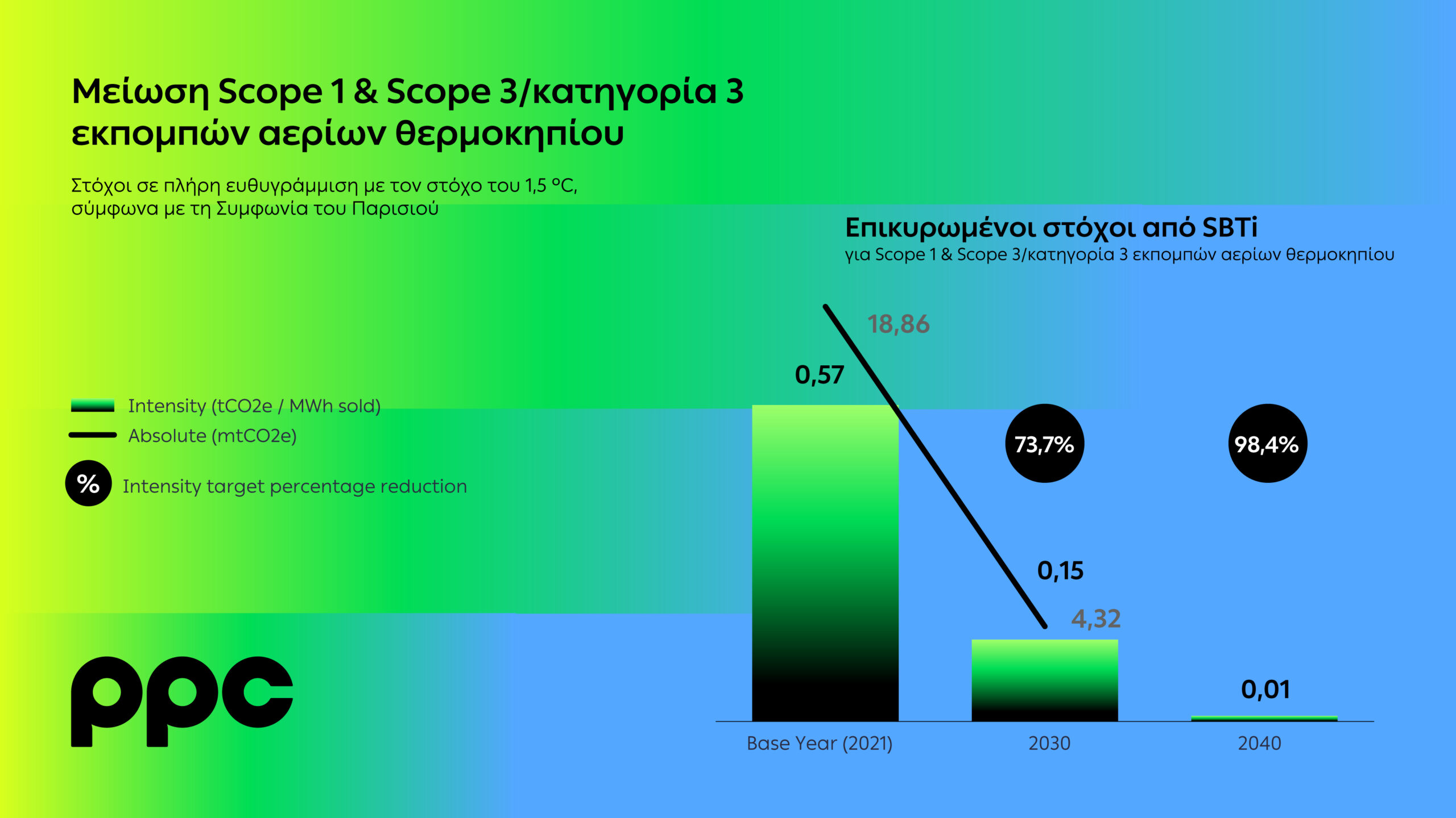 μείωση 98,4% ανά πωληθείσα MWh των Scope 1 και Scope 3/κατηγορία 3 εκπομπών αερίων θερμοκηπίου