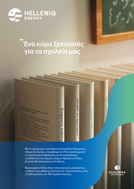 Για 16η συνεχή χρονιά, η HELLENiQ ENERGY στηρίζει τις τοπικές κοινωνίες μέσω της δράσης «Κύμα Ζεστασιάς», προσφέροντας δωρεάν πετρέλαιο θέρμανσης σε πάνω από 160 σχολεία σε Δυτική Αττική, Δυτική Θεσσαλονίκη και Κοζάνη. Η πρωτοβουλία αυτή διασφαλίζει ζεστά σχολικά περιβάλλοντα για περισσότερους από 23.200 μαθητές κάθε χρόνο.