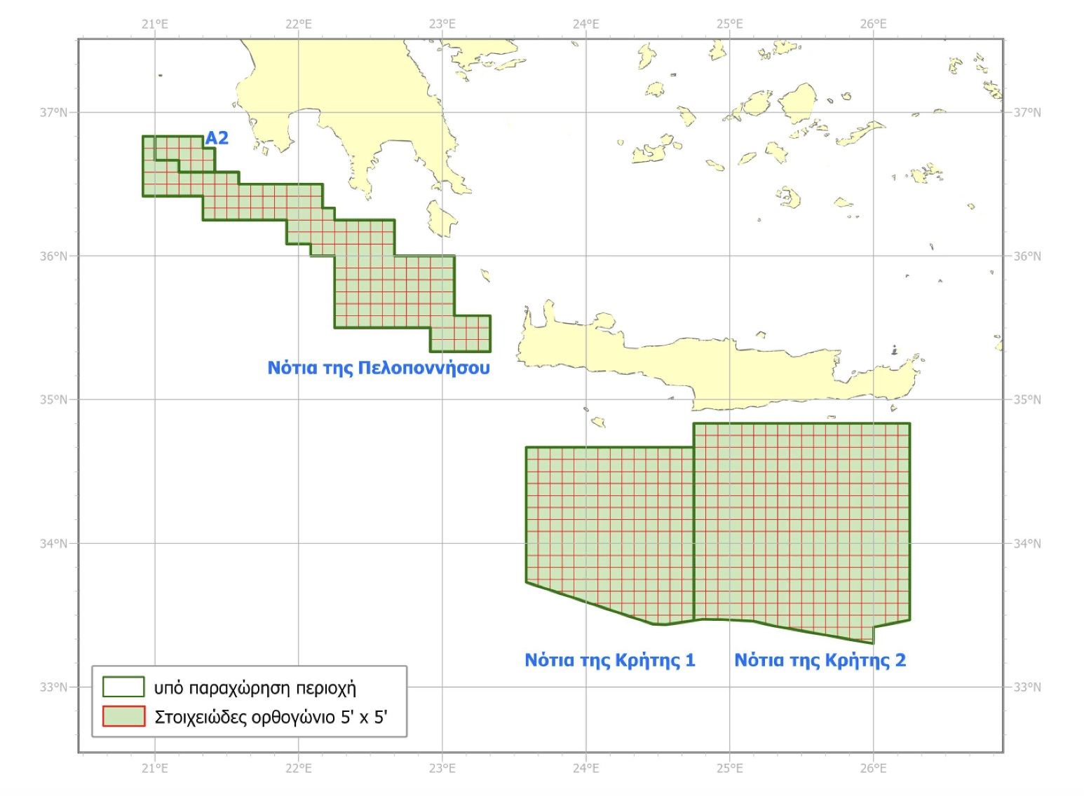 Οι περιοχές που παραχωρούνται καλύπτουν 47.000 τετραγωνικά χιλιόμετρα και αφορούν τα blocks «Α2» και «Νότια της Πελοποννήσου», καθώς και «Νότια της Κρήτης 1» και «Νότια της Κρήτης 2». Μετά την υπογραφή των τελικών συμβάσεων, την έγκρισή τους από το Ελεγκτικό Συνέδριο και την κύρωσή τους από τη Βουλή, θα ξεκινήσει η περίοδος ερευνών για τον εντοπισμό πιθανών κοιτασμάτων.