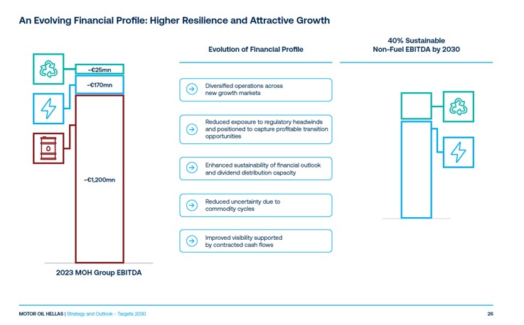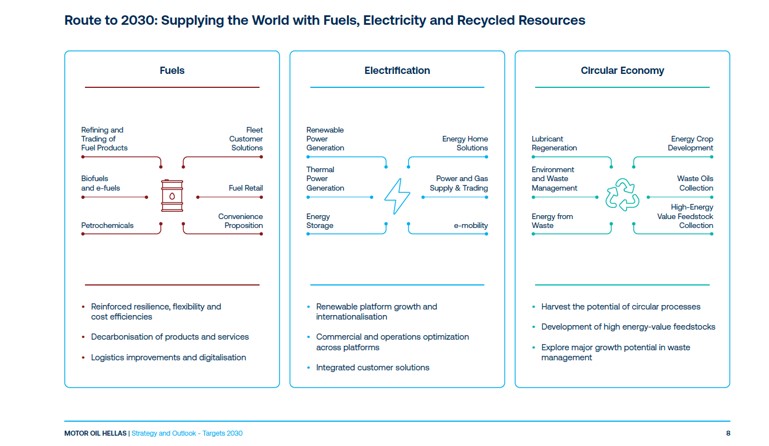 Θέτουμε τα θεμέλια, ώστε τα επόμενα 5 χρόνια, οι δραστηριότητές μας στον τομέα της ηλεκτρικής ενέργειας και της κυκλικής οικονομίας να αυξηθούν σε επίπεδο κλίμακας και οικονομικών επιδόσεων, με στόχο να αντιπροσωπεύουν τουλάχιστον το 40% του EBITDA του Ομίλου μας. Καθώς πραγματοποιείται αυτή η μετάβαση, αναμένουμε σημαντικές θετικές επιπτώσεις στο χρηματοοικονομικό προφίλ της Motor Oil.