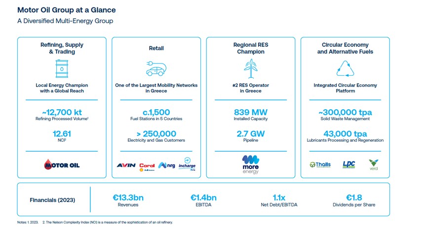 Από την ίδρυσή της, η Motor Oil ανέπτυξε ένα από τα πιο ευέλικτα και αποτελεσματικά διυλιστήρια στην Ευρώπη και εξασφάλισε μια επιχειρηματική δραστηριότητα εφοδιασμού και εμπορίας με μεγάλη τεχνογνωσία. Αυτή η συνδυαστική προσέγγιση ώθησε την  Motor Oil να υπερέχει οικονομικά και να είναι ανταγωνιστική σε διεθνές επίπεδο. Σήμερα, αποτελεί έναν ολοκληρωμένο και διαφοροποιημένο διεθνή ενεργειακό όμιλο, ο οποίος αναπτύσσεται σταθερά και υπεύθυνα με το βλέμμα στραμμένο στο αύριο της ενέργειας.