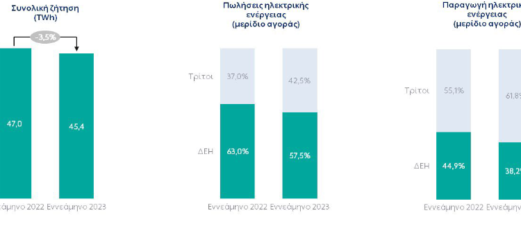Στην παραγωγή ηλεκτρικής ενέργειας, το μέσο μερίδιο της ΔΕΗ μειώθηκε σε 38,2% το εννεάμηνο 2023 από