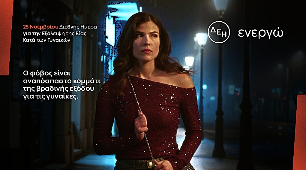 Για πέμπτη συνεχή χρονιά, η ΔΕΗ συμμετέχει ενεργά στη Διεθνή Ημέρα για την Εξάλειψη της Έμφυλης Βίας, φωτίζοντας μια ανησυχητική αλλά σιωπηλή πραγματικότητα: τον φόβο που βιώνουν οι γυναίκες κατά τις νυχτερινές μετακινήσεις τους. Η νέα πανελλαδική έρευνα, που πραγματοποιήθηκε σε συνεργασία με τη FocusBari και τη DDB στο πλαίσιο της πρωτοβουλίας «ΔΕΗ Ενεργώ», καταγράφει ότι 8 στις 10 γυναίκες νιώθουν φόβο όταν κυκλοφορούν βράδυ και 6 στις 10 έχουν βιώσει ή γνωρίζουν περιστατικό απειλής.