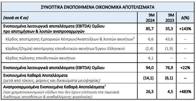 Ακόμα αύξηση 483% έναντι του 2023 στα Αναπροσαρμοσμένα Καθαρά Αποτελέσματα στα €26 εκατ. ενώ τα συνολικά κέρδη προ-φόρων ανήλθαν σε €173 εκατ. (€0,98 ανά μετοχή) από τις 3 πρόσφατες συναλλαγές πωλήσεων οικοπέδων στο Έργο του Ελληνικού, εκ των οποίων μόλις €39 εκατ. έχουν αναγνωριστεί μέχρι σήμερα.
