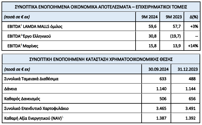 Εξαιρετικές οικονομικές επιδόσεις παρουσίασε η Lamda Development στα οικονομικά αποτελέσματα για το εννεάμηνο του 2024. Ειδικότερα ανακοίνωσε αύξηση 155% στα ενοποιημένα κέρδη EBITDA προ αποτιμήσεων στα €89,8 εκατ.
