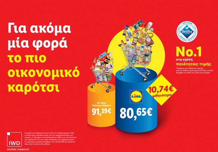Σε μια περίοδο όπου η ακρίβεια στα προϊόντα πρώτης ανάγκης πιέζει τα ελληνικά νοικοκυριά και οι εβδομαδιαίες αγορές στο super market γίνονται ολοένα και πιο δύσκολες, η Lidl Ελλάς στέκεται για ακόμα μία φορά δίπλα στους καταναλωτές. Με τη νέα της καμπάνια και κεντρικό μήνυμα «Για ακόμα μία φορά, το πιο οικονομικό καρότσι», η εταιρεία αποδεικνύει έμπρακτα τη δέσμευσή της να προσφέρει την καλύτερη σχέση ποιότητας – τιμής, με σαφή διαφορά από τον ανταγωνισμό.