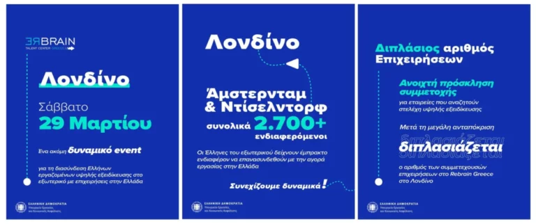 Στο Λονδίνο στις 29 Μαρτίου θα πραγματοποιηθεί η επόμενη στάση στης δράσης εξωστρέφειας «Rebrain Greece» με εκατοντάδες υψηλόβαθμες θέσεις εργασίας από το υπουργείο Εργασίας και Κοινωνικής Ασφάλισης.