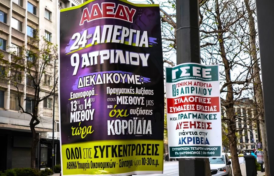 Με γενική 24ωρη απεργία απαντούν εργαζόμενοι του δημόσιου και του ιδιωτικού τομέα στις 9 Απριλίου, έπειτα από κάλεσμα της ΓΣΕΕ και της ΑΔΕΔΥ. Η χώρα εισέρχεται σε τροχιά κινητοποιήσεων, με αιχμή τις αυξήσεις στους μισθούς, την επαναφορά του 13ου και 14ου μισθού στο Δημόσιο, τις Συλλογικές Συμβάσεις Εργασίας και την ανάγκη για ουσιαστικά μέτρα κατά της ακρίβειας και της στεγαστικής κρίσης.
