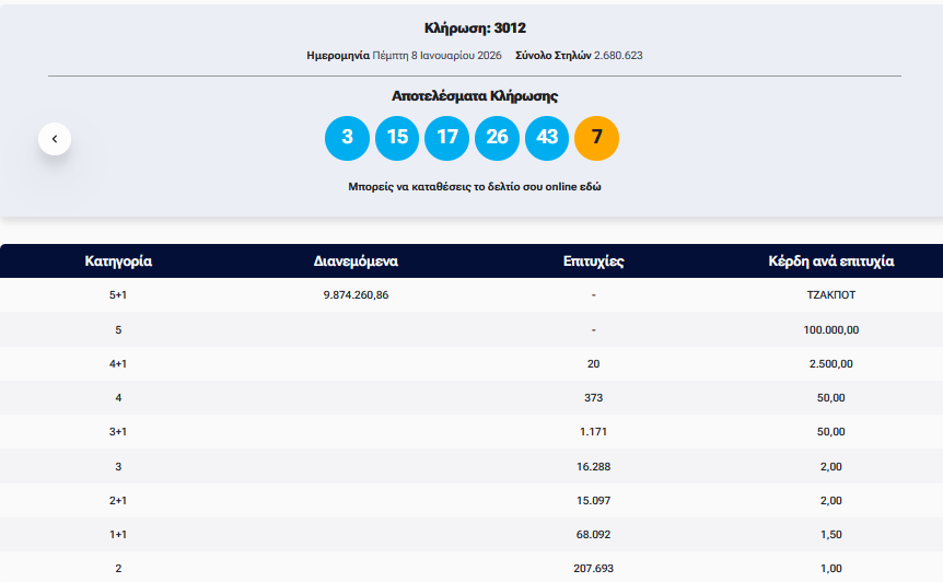 Οι τυχεροί αριθμοί στην κλήρωση τζόκερ σήμερα είναι: 3, 15, 17, 26, 43 και τζόκερ ο αριθμός 7.