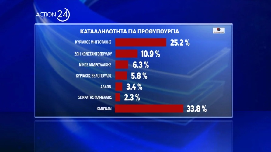 Σημαντικές μεταβολές στις πολιτικές ισορροπίες καταγράφει η νέα δημοσκόπηση της Opinion Poll για το Action24, με την Πλεύση Ελευθερίας να αναδεικνύεται δεύτερη πολιτική δύναμη, ξεπερνώντας το ΠΑΣΟΚ.