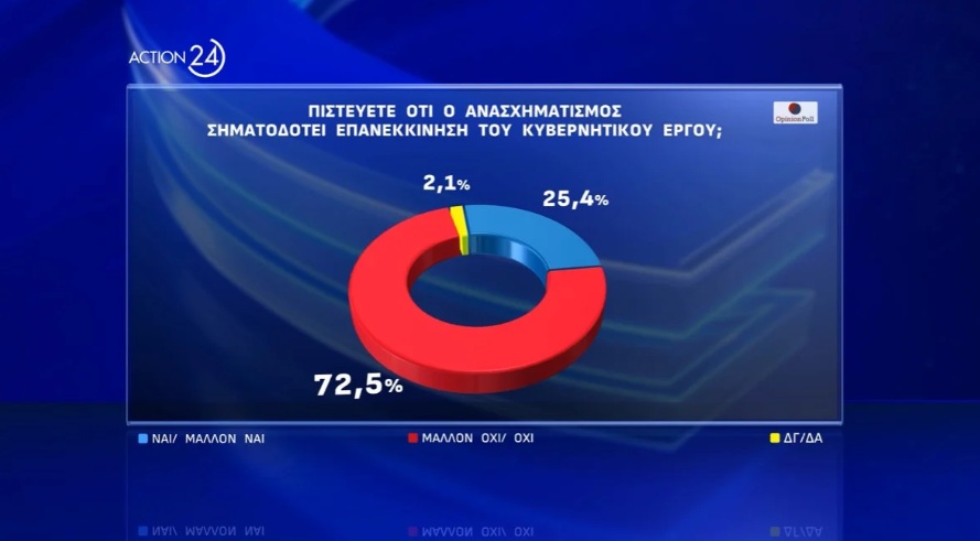 Ο πρόσφατος ανασχηματισμός δεν φαίνεται να έπεισε τους πολίτες, καθώς το 72,5% εκτιμά ότι δεν σηματοδοτεί επανεκκίνηση του κυβερνητικού έργου. Επιπλέον, η τοποθέτηση αναπληρωτή υπουργού Υποδομών και Μεταφορών δεν θεωρείται επαρκής, με το 62,1% να δηλώνει ότι δεν διαφαίνεται ουσιαστική βελτίωση στην ασφάλεια των μεταφορών.