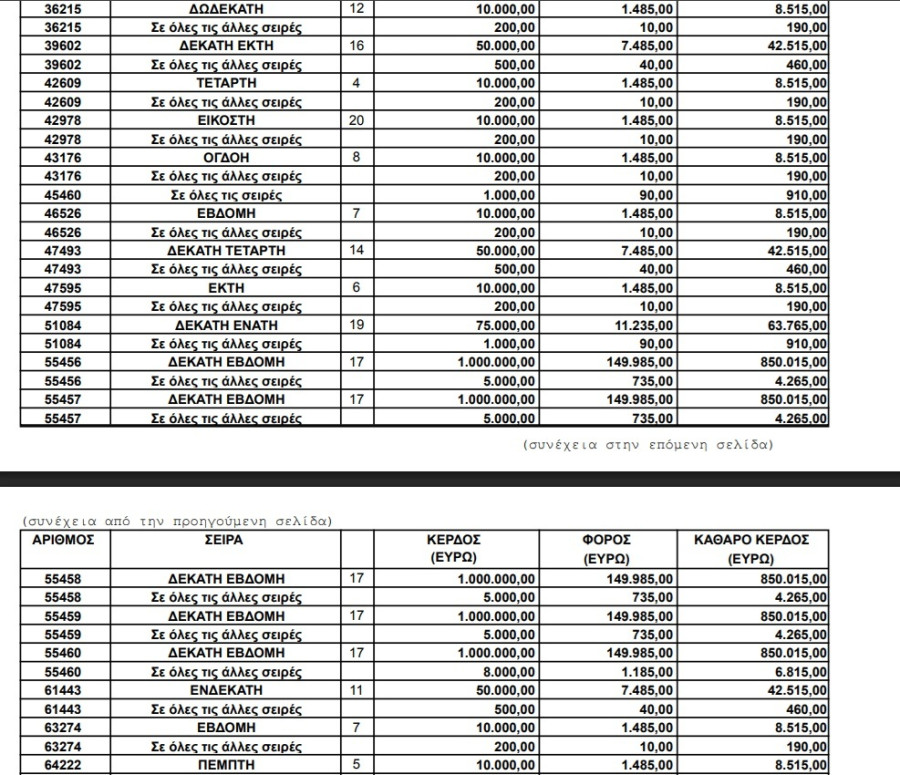 Ακολουθεί ο πίνακα των τυχερών δελτίων και των κερδών: