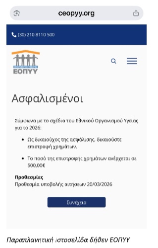 Σε κάθε περίπτωση, υπογραμμίζεται ότι ο ΕΟΠΥΥ δεν ζητά ποτέ προσωπικά ή τραπεζικά στοιχεία μέσω SMS ή email, ούτε αποστέλλει συνδέσμους για οικονομικές συναλλαγές.